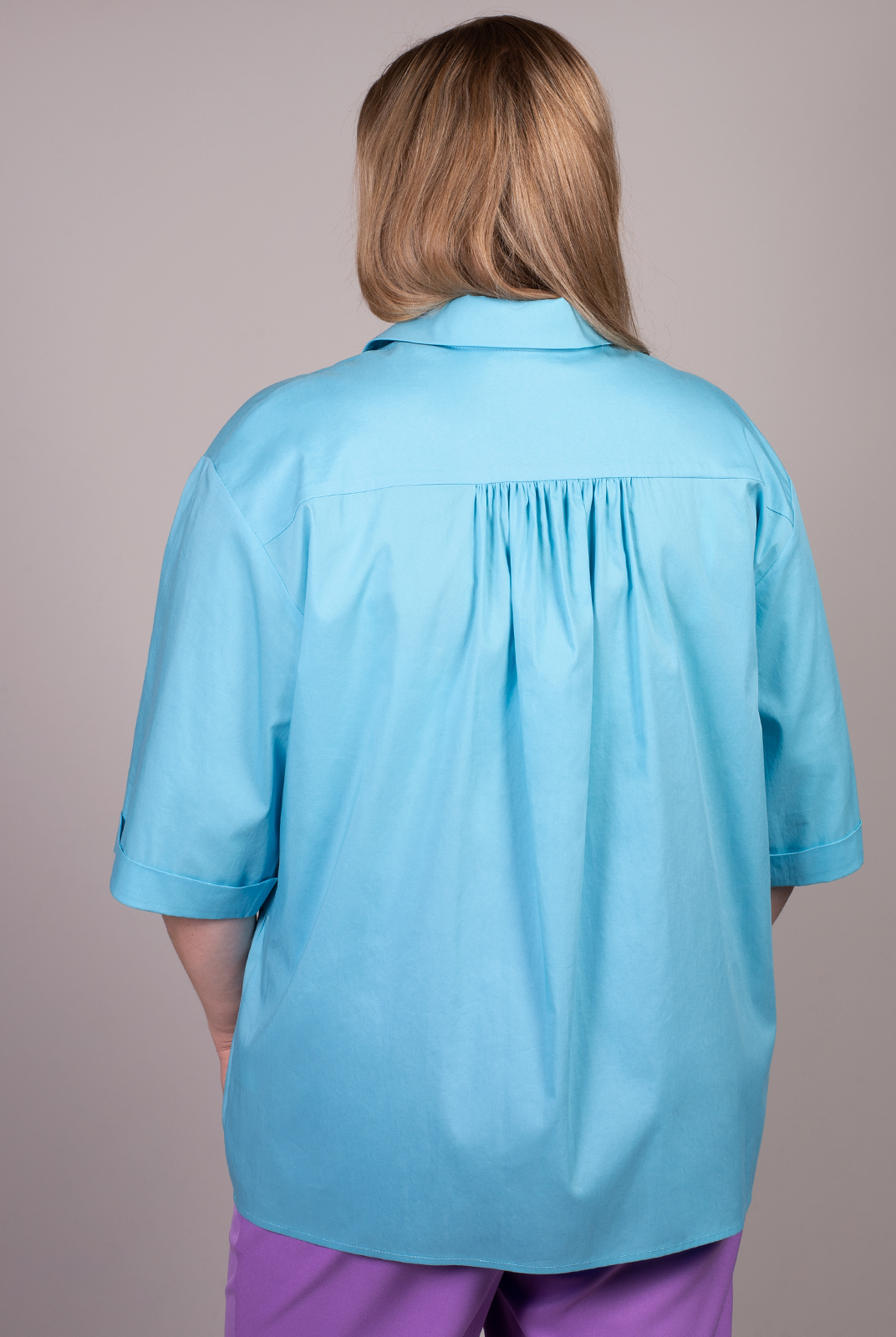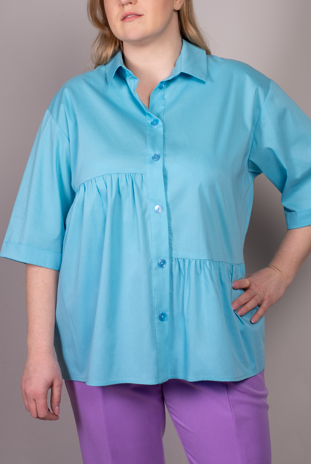 Для расслабленных летних образов подойдет блузка-рубашка с асимметричной сборкой по переду. Сорочечная ткань приятного голубого оттенка создаст ощущение комфорта и непринужденности. Достойной парой к блузке станут брюки или шорты. |