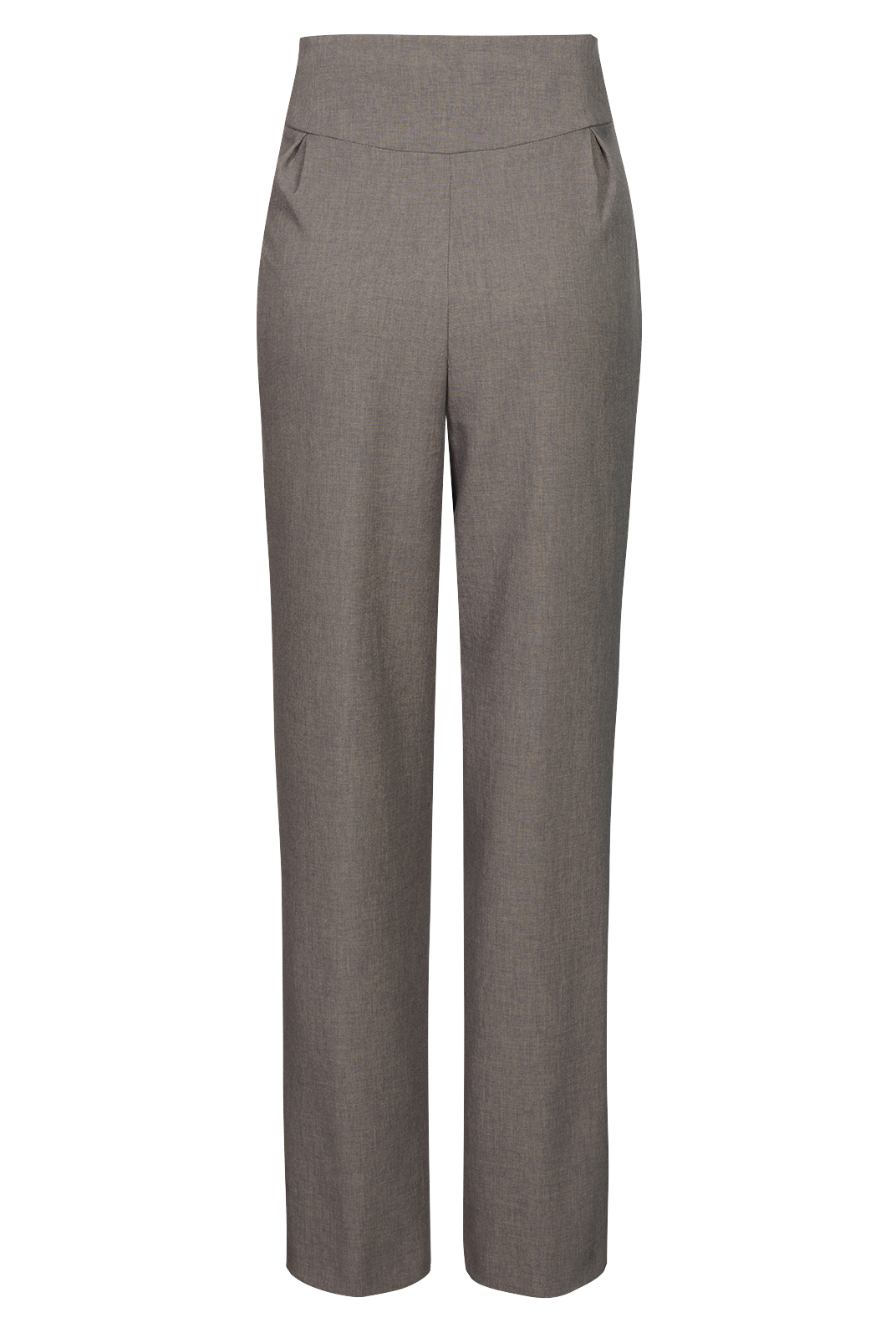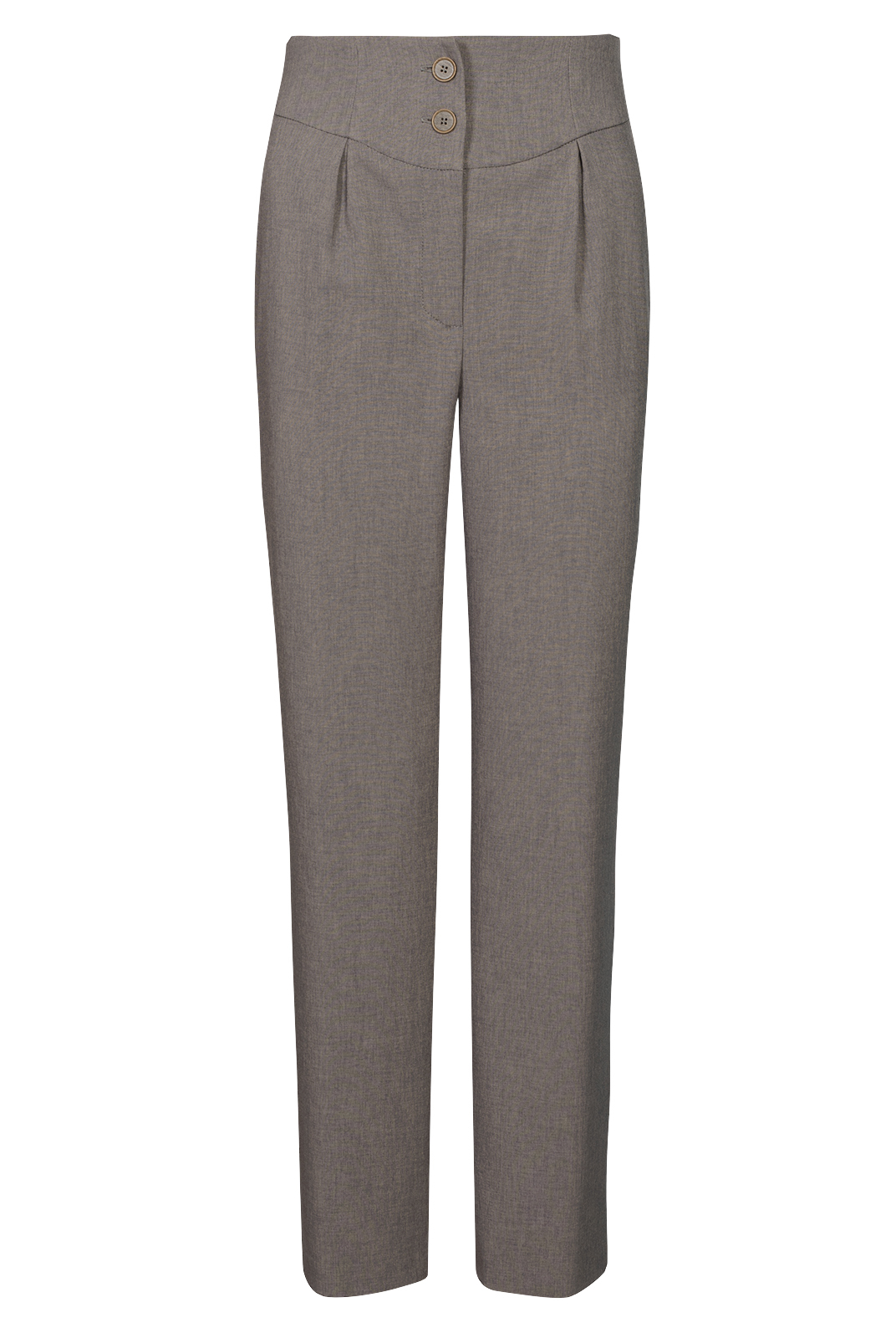 Однотонные брюки полуприлегающего силуэта из костюмной ткани. Модель, зауженная книзу, дополнена оригинальным фигурным притачным поясом.