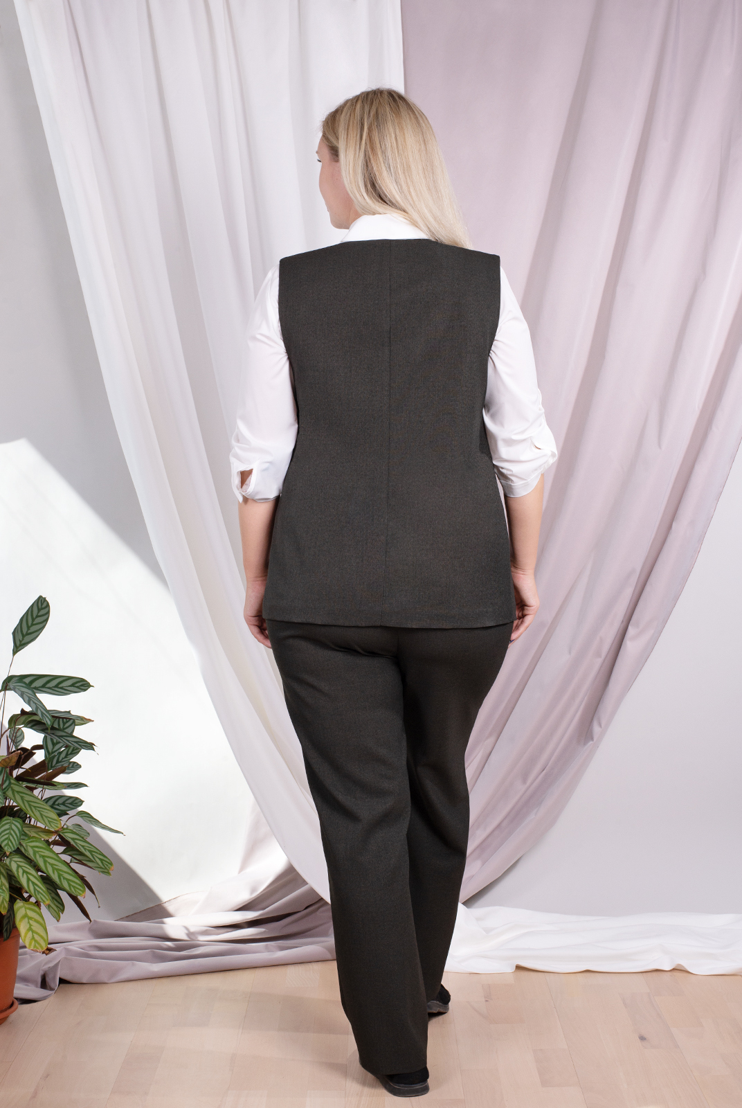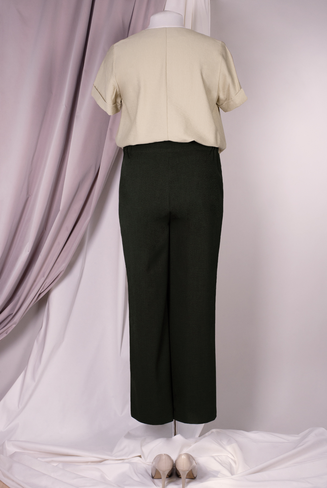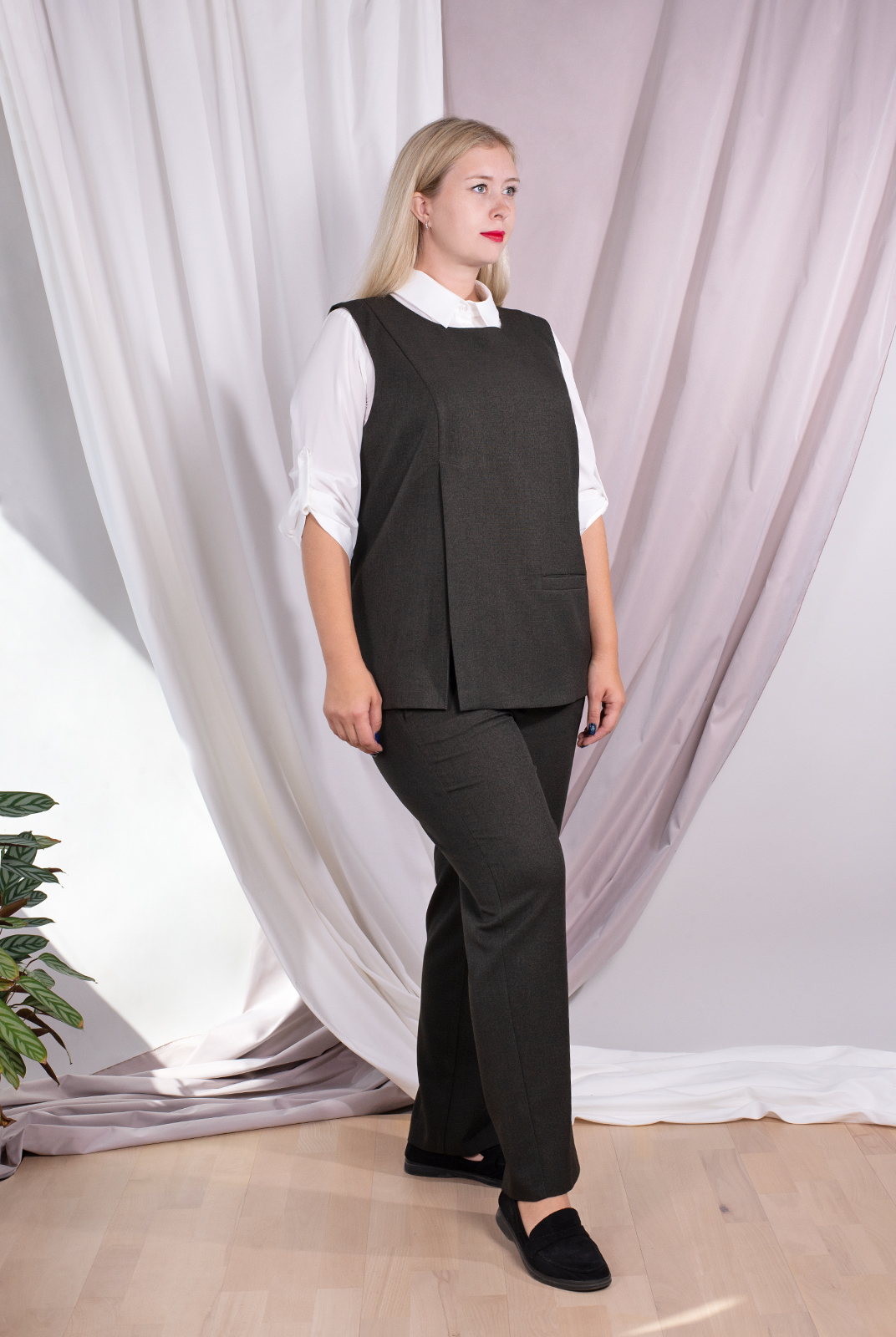 Выразительные брюки полуприлегающего силуэта, выполнены из костюмной однотонной ткани. Высокая посадка с притачным поясом акцентирует линию талии. Зауженные брючины подчеркнут стройность ног и легкость походки.