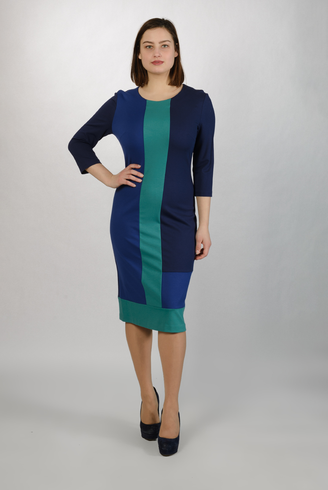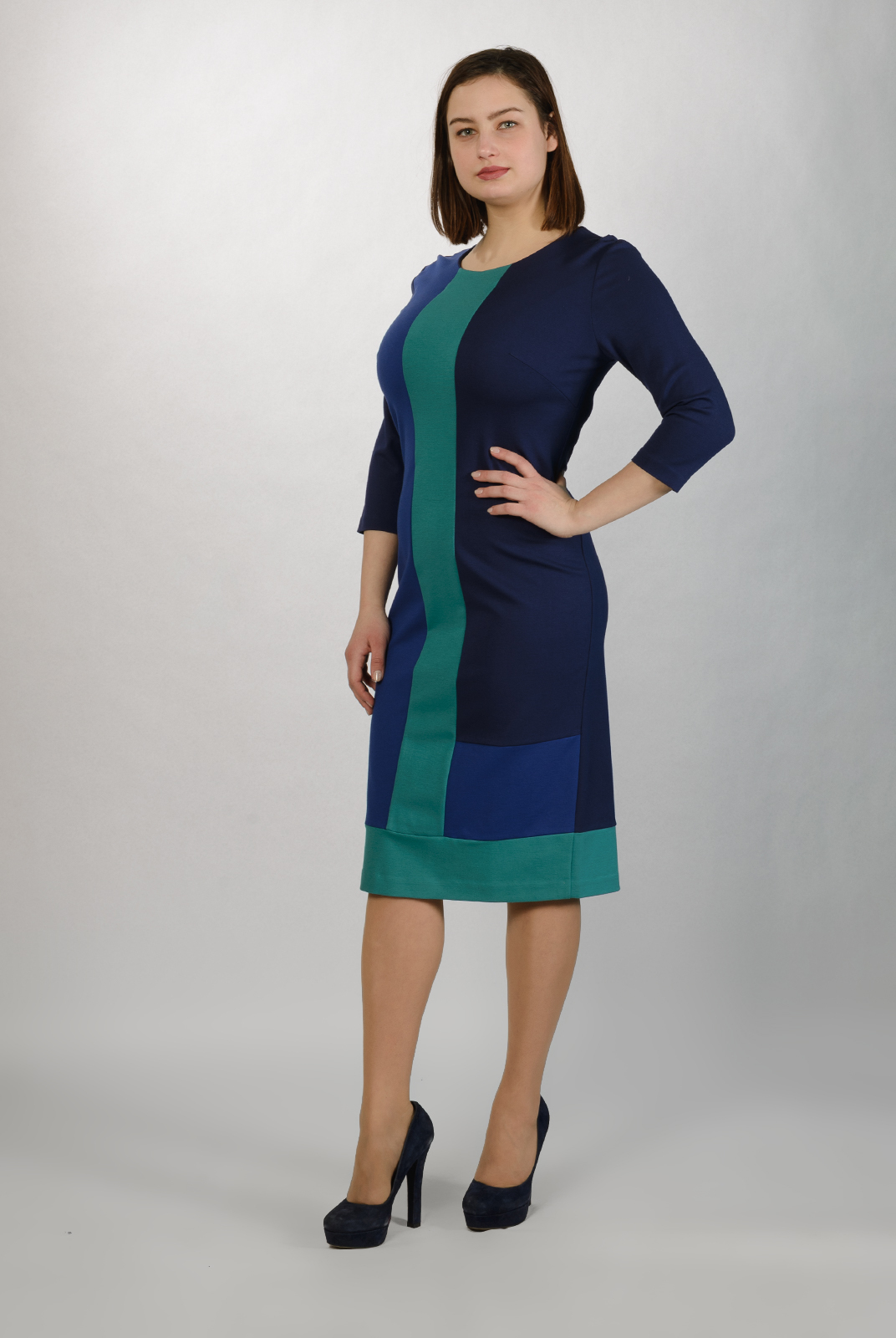 Платье полуприлегающего силуэта, скомбинировано из ткани разных цветов. Данная модель хорошо впишется в повседневный гардероб.