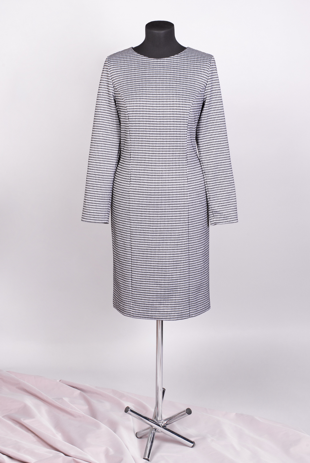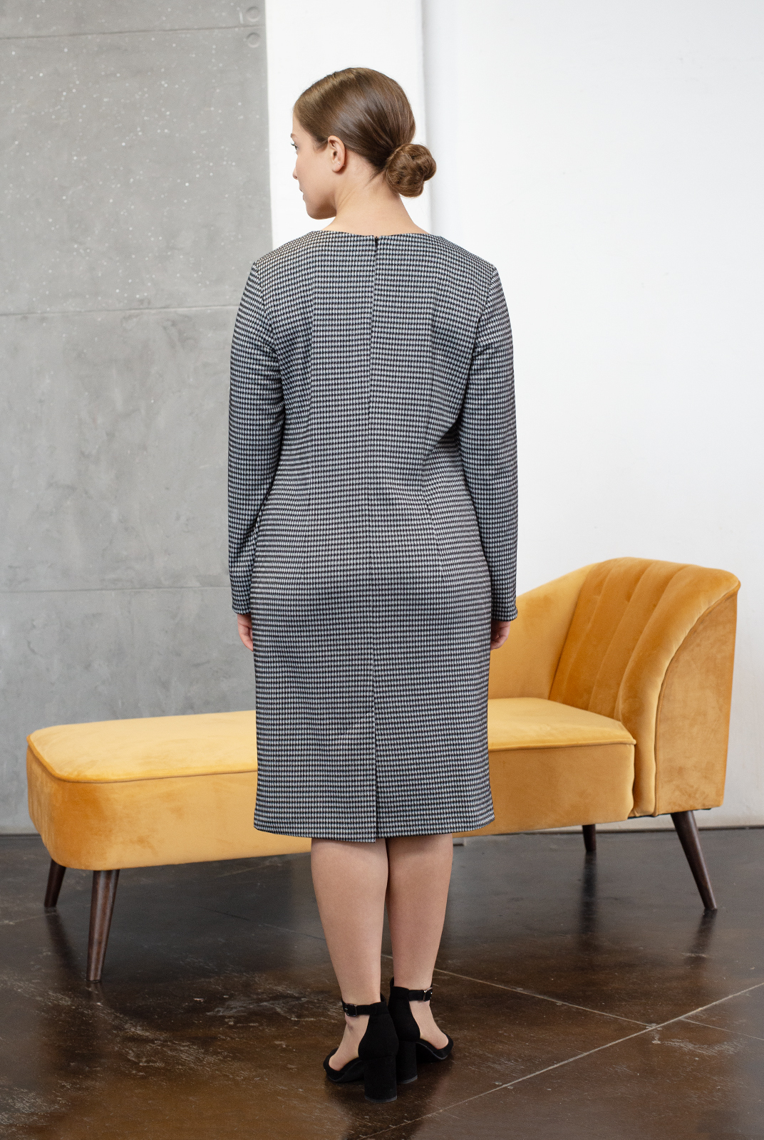 Лаконичное трикотажное платье классического принта куриная лапка - отличный вариант для офиса. Строгие прямые линии, стандартная длина рукава, аккуратный вырез горловины. Для свободы движения предусмотрена шлица. Модель может выступать соло, а также в тандеме с жакетом или удлиненным жилетом. |