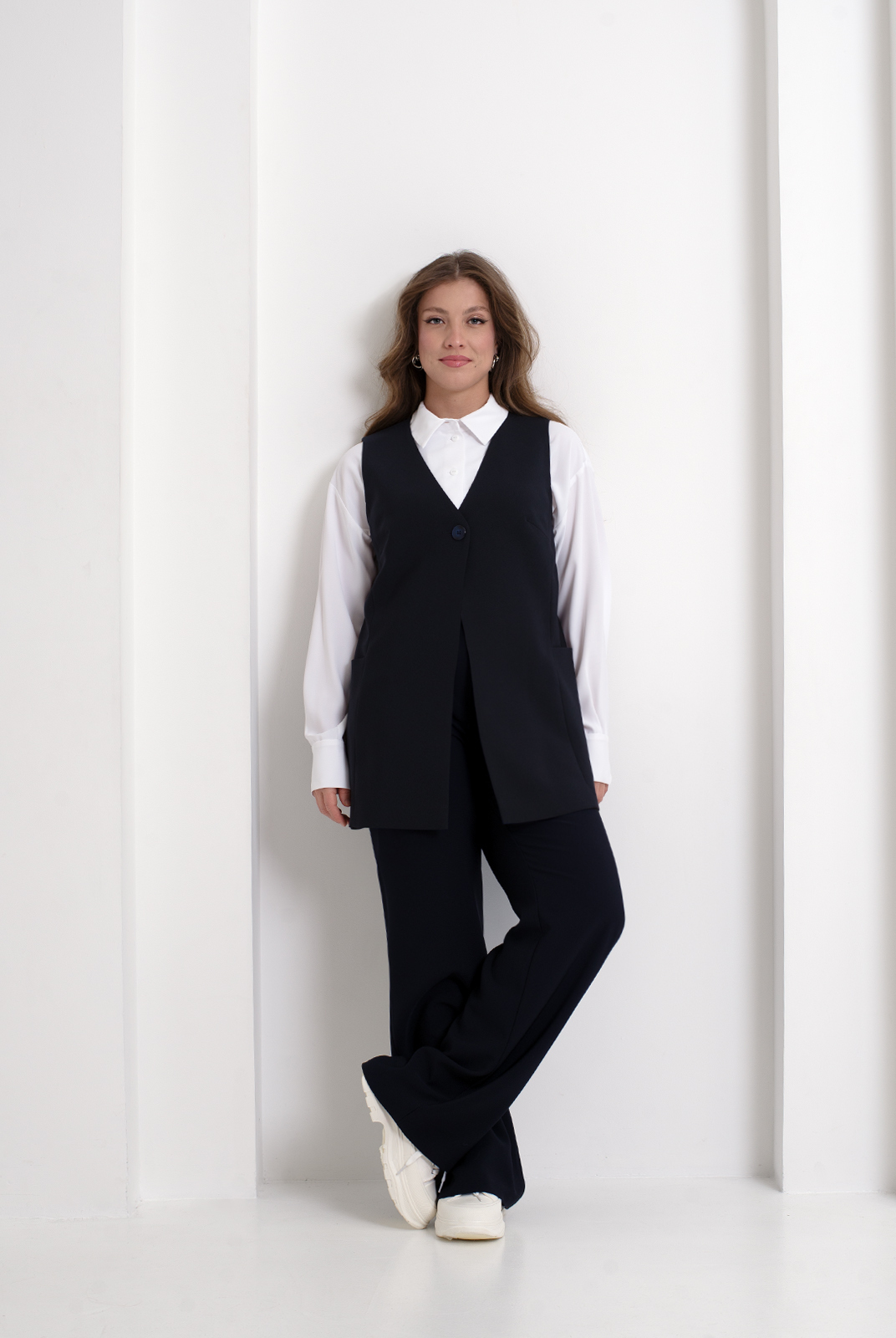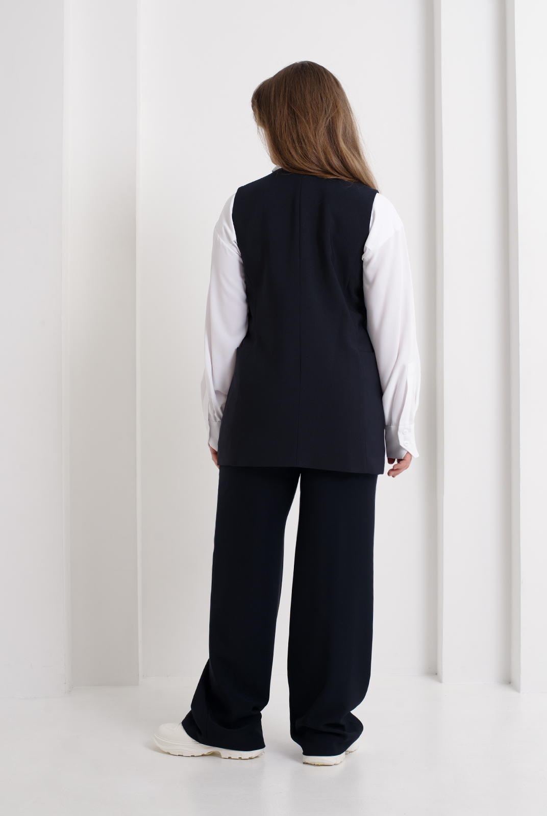 Классический жилет из костюмной ткани - универсальный предмет гардероба, способный придать легкую ноту элегантности даже повседневным образам. Полуприлегающий силуэт зрительно стройнит фигуру за счет четко оформленных вертикалей. Карманы, расположенные между рельефными швами переда и спинки, придают модели функциональность. Жилет рекомендуется в комплекте с юбкой или бермудами из аналогичной ткани.