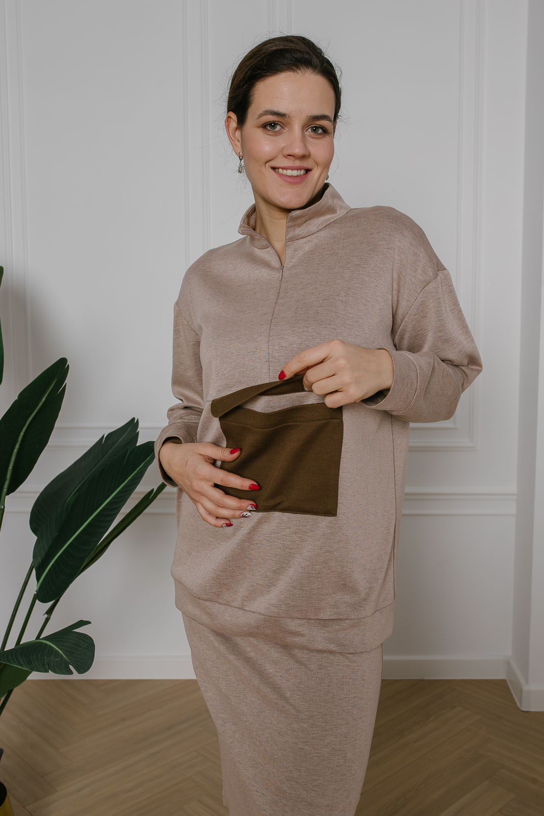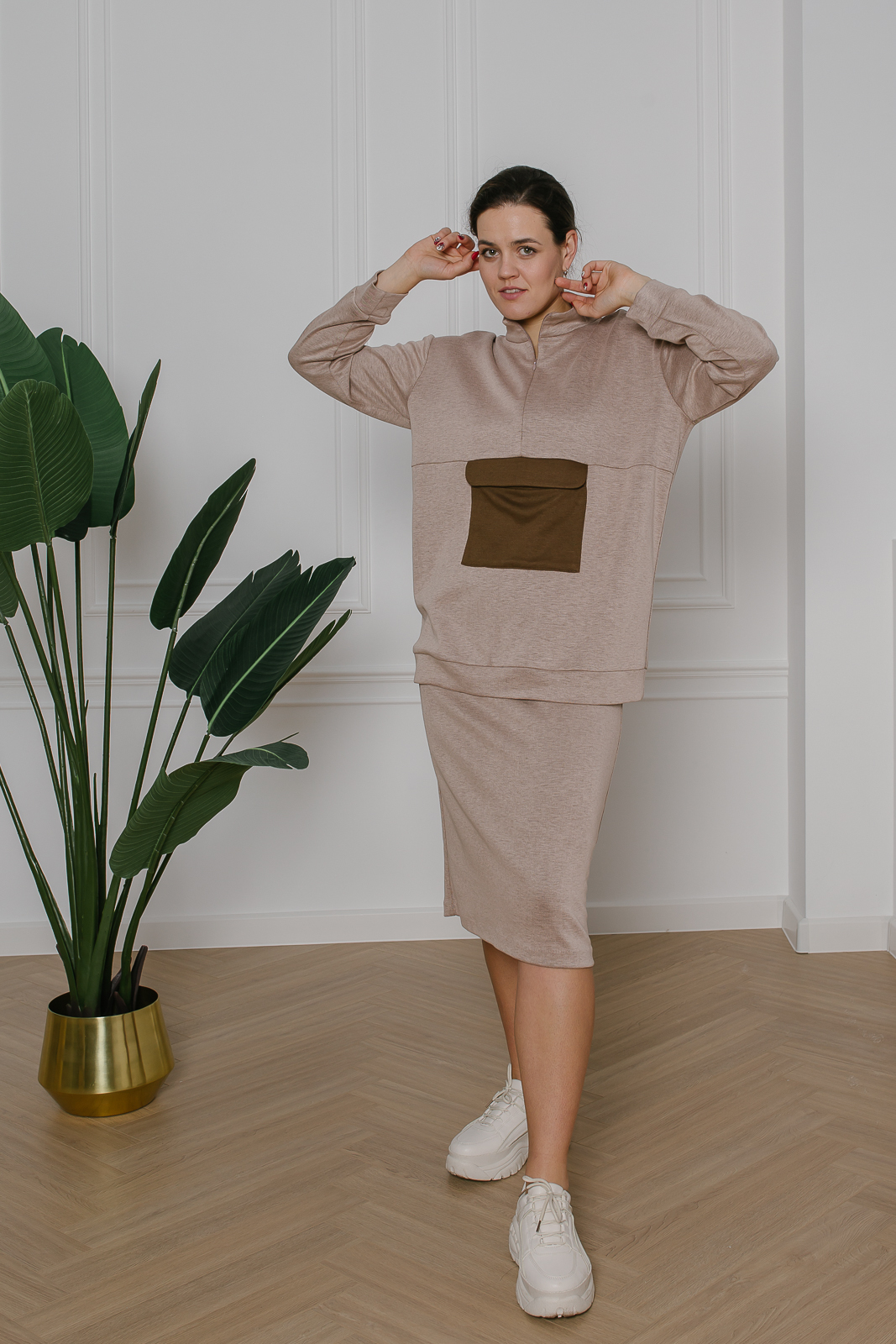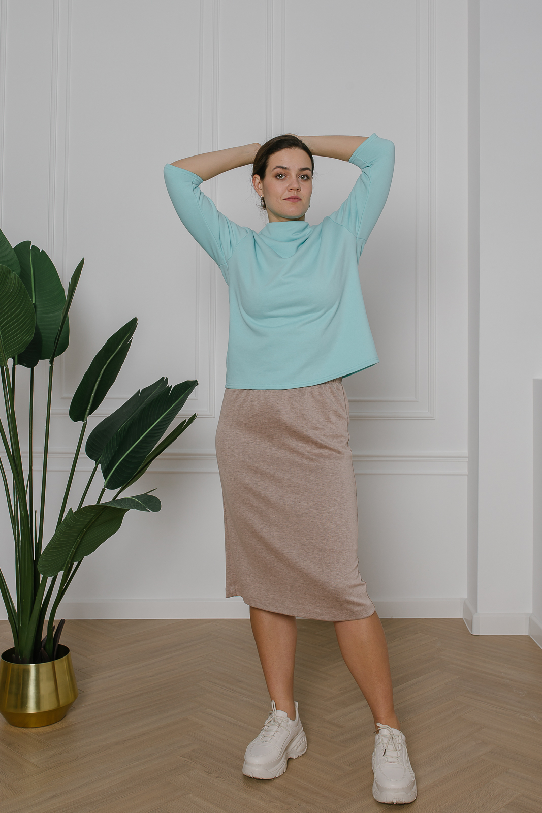Трикотажная юбка нейтрального бежевого оттенка под орех - отличный вариант для спорта и отдыха. В пояс вставлена эластичная резинка, что обеспечивает комфоритную посадку на талии. На свободу движения предусмотрен разрез. Для создания лаоничных образов рекомендуются модели из той же капсулы.